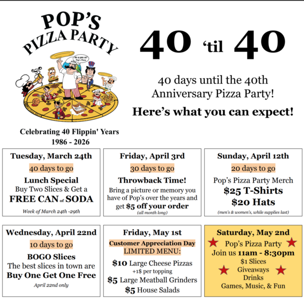 Join us to celebrate our 40th anniversary with pizza, games, music, and fun the first weekend in May. We can't wait to see you there!